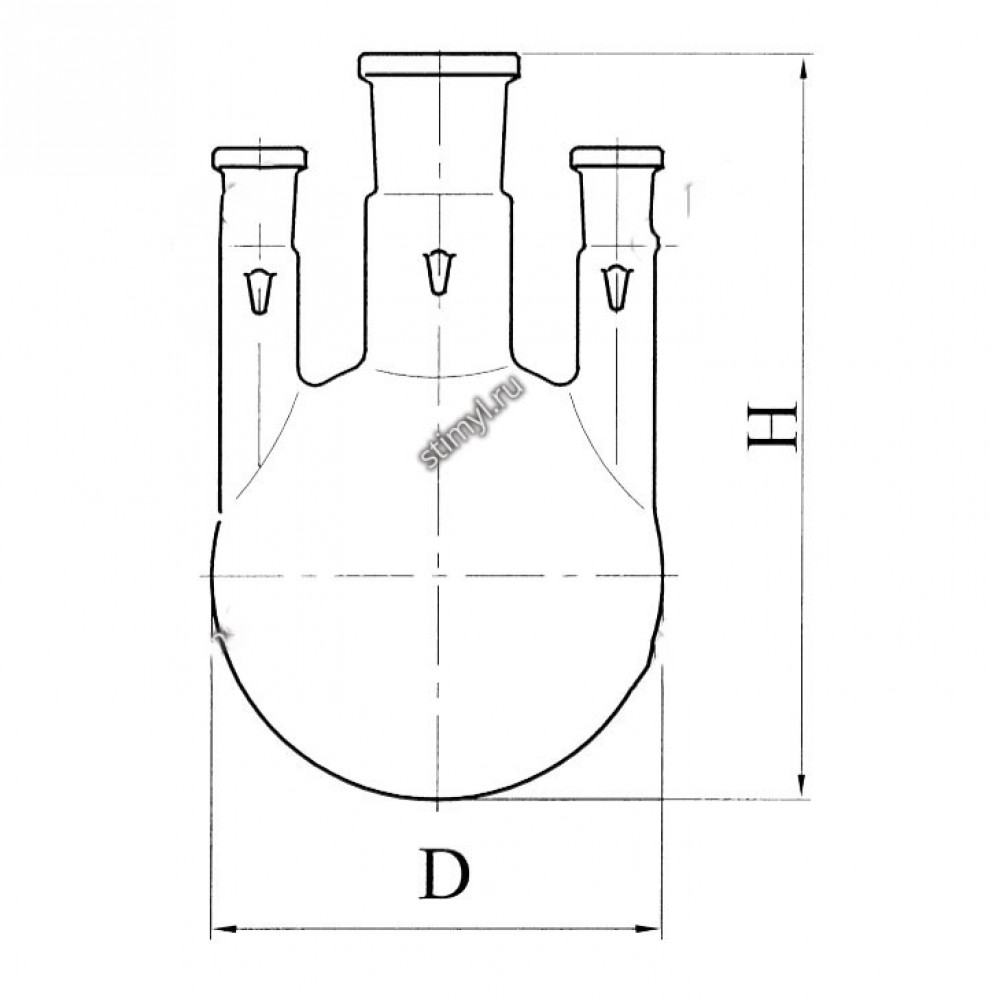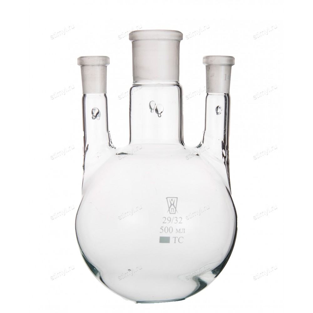 Колба КГП-3 круглодонная с 3-мя параллельными горловинами с шлифами применяется при проведении различных синтезов, требующих применения термометра, холодильника, мешалки, воронки и т.д. Изготовляются из стекла ТС ГОСТ 21400-75 и Симакс ЧСН ИСО 3585.